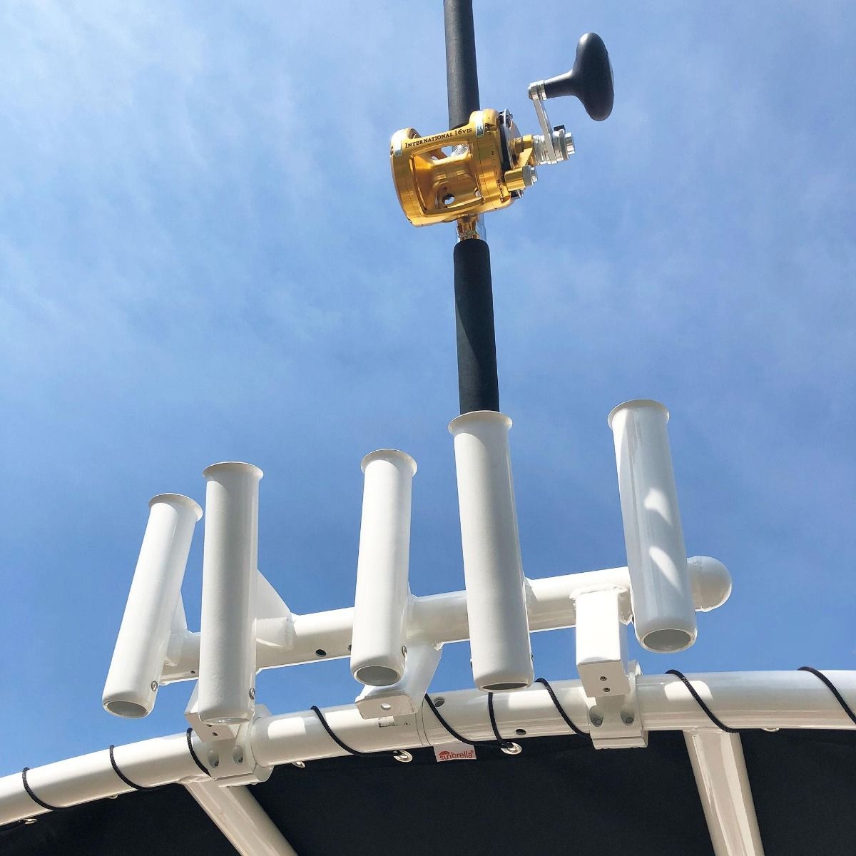 Dieser T-Top-Rutenhalter bietet eine clevere und robuste Lösung für die sichere Aufbewahrung von fünf Ruten in Reichweite. Das kompakte Design bleibt mit knapp über 60 cm Breite praktisch, während der großzügige Abstand auch größere Rollenkombinationen ermöglicht. Hergestellt aus 6061-T6 Marine-Aluminium für Langlebigkeit, verfügt er über verstärkte Kardanbolzen, die ein Verdrehen der Ruten verhindern und einen einfachen Zugriff von Deck aus ermöglichen.