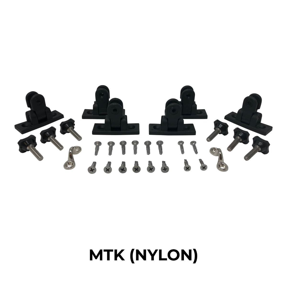 Met deze set vervang je de bevestigingscomponenten van je Over the Top Bimini in één keer. De zijbeugels met draaiknoppen maken afstellen eenvoudig, terwijl de universele zwenkbeugels met 90° hoek een solide montagepositie bieden. Duimschroeven, oogjes en bijbehorend bevestigingsmateriaal zorgen voor een nette en functionele installatie. Zo houd je alle onderdelen op elkaar afgestemd binnen de MTK-variant.